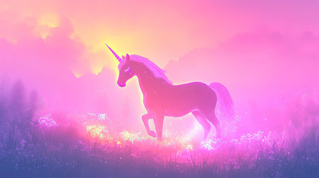 A mythical unicorn with pink mane and a golden horn stands in a field. The creature is illuminated by soft sunlight and warm tones. The composition and style are suitable for both commercial and editorial uses, with copy space available. The scene evokes a sense of fantasy and wonder.