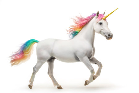 Mythical unicorn galloping with a vibrant rainbow mane and tail, set against a pure white background, embodies elegance and fantasy