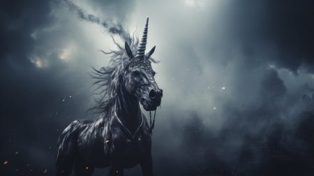 a dark unicorn, surrounded by storm clouds, embodies the essence of techno shamanism. mist-like in appearance, it showcases a realistic portrayal of light and shadow. the burned, charred, and twisted characters add an edgy touch to this artwork, which also incorporates thought-provoking political commentary. this captivating image is reminiscent of the unique style of joel robison. ai generated