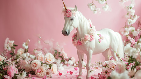 White unicorn with pink flowers on pink background, valentine concept