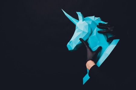 Unicorn head paper on black background. Hands in black gloves hold a turquoise Unicorn. Copy space
