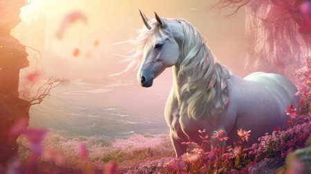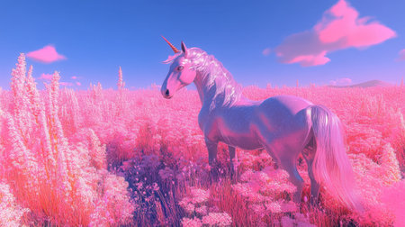 In a lush, enchanting landscape, a majestic unicorn gazes elegantly amidst a blooming field of pink flowers, basking under a clear blue sky dotted with wispy clouds.