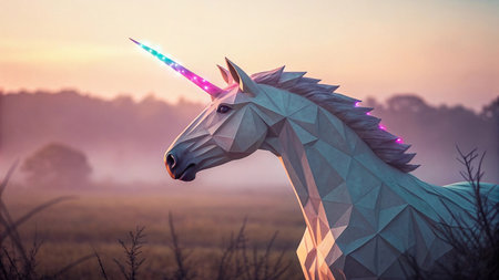 Geometric unicorn sculpture shines with neon horn in misty pastel landscape