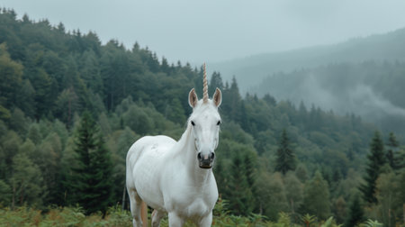 Majestic white unicorn in a misty forest