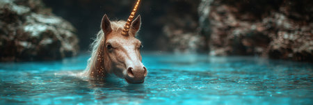 Mythical unicorn swimming in enchanted forest pool