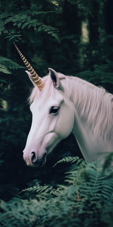 Enchanted white unicorn with golden horn in mystical forest surrounded by lush greenery tranquility and magic.