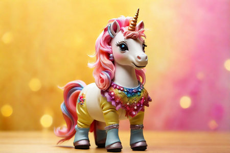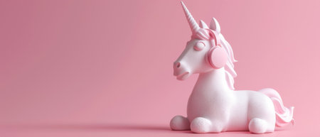 A detailed unicorn figure with a white body and pink mane stands gracefully against a soft pastel pink backdrop, creating a whimsical and enchanting atmosphere.