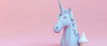 This is a concrete unicorn statue with an ice cream horn on a pastel pink background. A creative idea. A minimalist concept. A 3-D rendering.