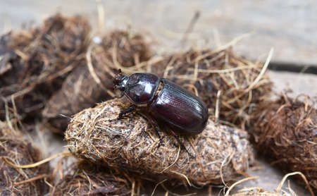 A Coconut rhinoceros beetle( Oryctes Rhinoceros ) sitting on the pupa . it is insect pests to destroy coconut tree .