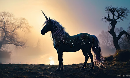 AI-Generated image of a powerful black unicorn standing in a misty meadow at dawn. Its midnight-black coat gleams with subtle highlights, while its spiraled horn glows faintly with a radiant, magical light.