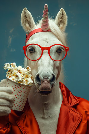 A whimsical contemporary art collage depicting a horse with a unicorn horn wearing red glasses and enjoying popcorn.