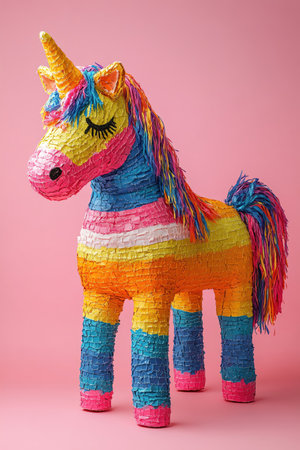 Colorful unicorn pinata on a pink background, playful and festive