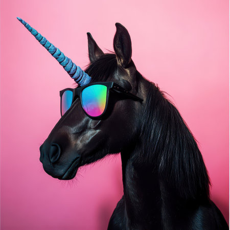 A black unicorn with a colorful horn wears sunglasses in front of a vibrant pink background. This whimsical creature captures attention and charm.
