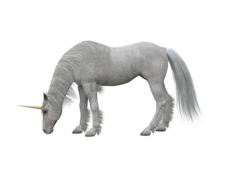 White unicorn grazing. Fairytale creature 3d illustration isolated on white background.