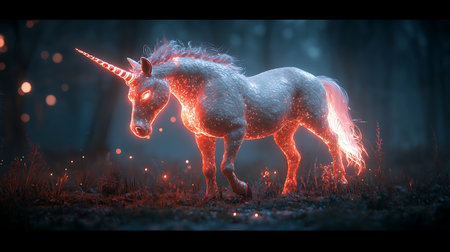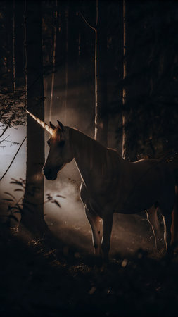 Magical unicorn in enchanted forest surrounded by mystical light.