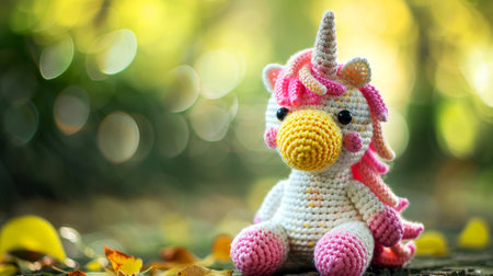 Crochet unicorn toy with autumn leaves in soft light