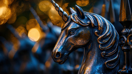 A silver unicorn statue with a blue background. The statue is surrounded by other statues of horses