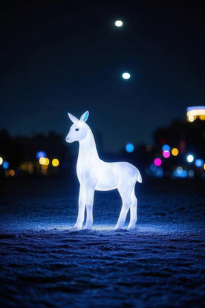 White unicorn standing on the road at night in the city. New Year and Christmas concept.