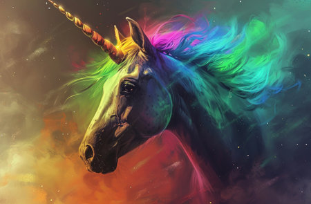 Artistic rendition of a mythical unicorn, complete with a spiraling horn against a vividly colored fantasy background