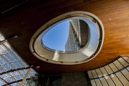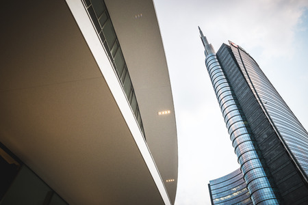 MILAN, ITALY - APRIL 28, 2017: Detail of Unicredit Tower in Milan, Italy. Tower was opened at 2012 and with 231 metres, it is the tallest building in Italy