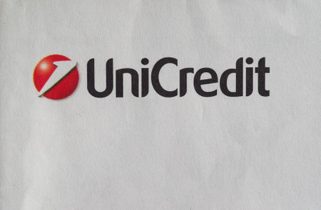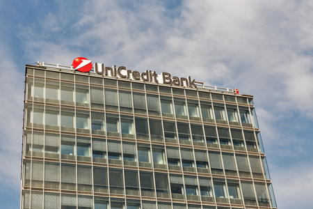 BRATISLAVA, SLOVAKIA - SEPTEMBER 26, 2017: Unicredit bank logo on top of the office building. Unicredit S.p.A. is one of the biggest Italian and European credit groups.