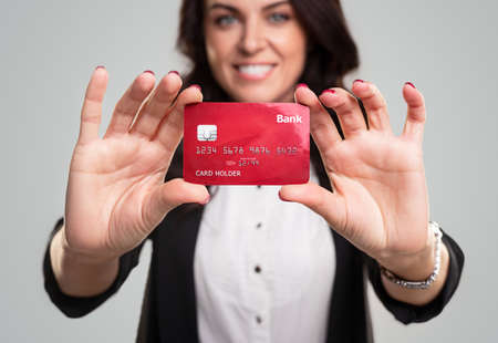 Happy businesswoman showing credit card to camera