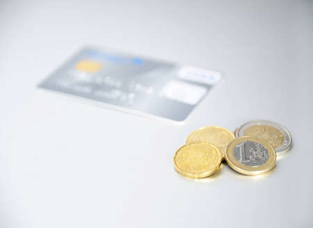 Close-up of a credit card with a chip with columns of coins. Financial business background