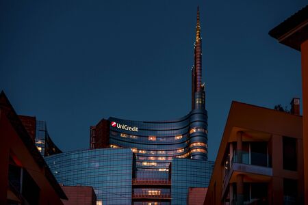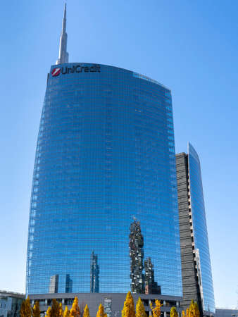 Milan, Italy. The iconic Unicredit tower at Gae Aulenti square. Skyscraper which is part of a group of residential and business buildings. Architectural modern buildings