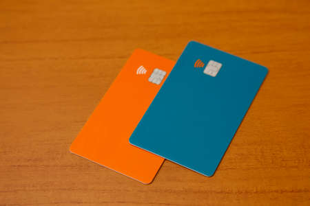 green and orange credit or debit contactless cards with contact less sign. Digital payment system.