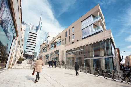 MILAN, ITALY - Mar 11, 2014: People walk in the new business district of Milan, in the background the Unicredit Tower, in Gae Aulenti square, modern buildings and skyscrapers