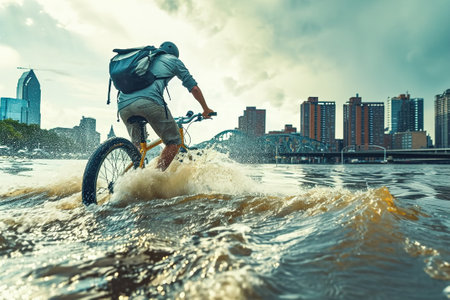 Man on Water Bike in big city river, Bicycle designed to be ridden on water surfaces.