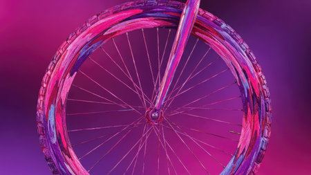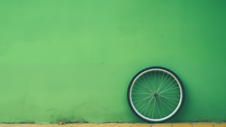 An AI illustration of a bicycle wheel leaning against a green wall.