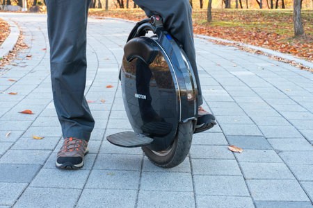 Seoul - 05.11.2022: A man rides electric unicycle Inmotion in city park.