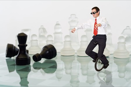 Businessman keeping his balance riding a mono cycle on a chess board