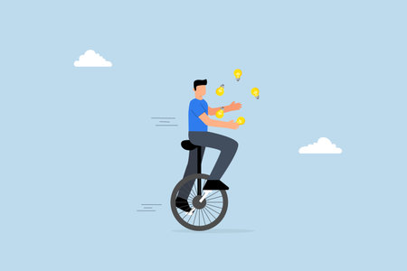 Creativity and ideas, astute entrepreneur balancing on unicycle tossing light bulb lamp imagery numerous concepts.