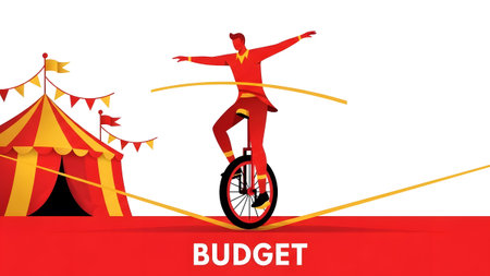Circus performer balances on a unicycle on a tightrope, symbolizing the precariousness of a budget