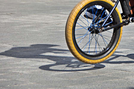 Bicycle wheel on the road. Close-up of a bicycle wheel.