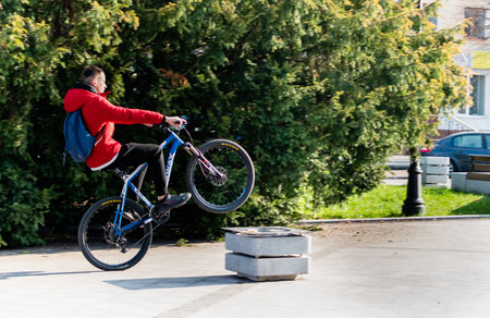 Guy in red jacket riding a bicycle on the rear wheel on sunny day. Ukraine, Zhytomyr, November 12, 2022