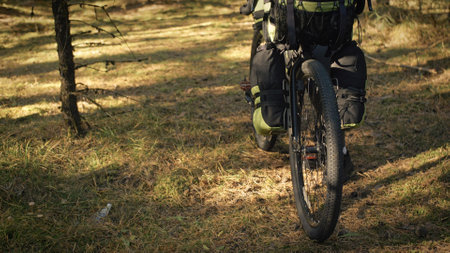 The woman travel on mixed terrain cycle touring with bike bikepacking outdoor. The traveler journey with bicycle bags. Stylish bikepacking, bike, sportswear in green black colors. Magic forest park.