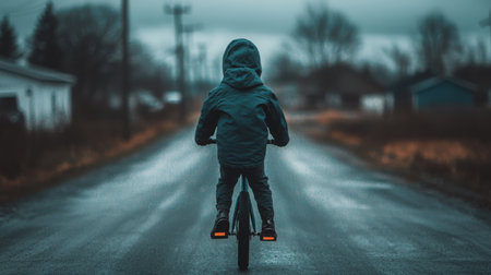 A young child rides a bicycle on an empty road, surrounded by a dramatic, overcast sky. The scene captures the essence of adventure, freedom, and exploration.