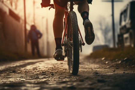 Low-angle view of a cyclist riding along a country road at sunset. Concept of freedom, adventure, healthy lifestyle, outdoor sports, and evening cycling.