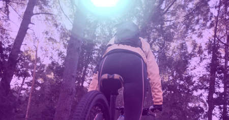 Composition of woman riding bicycle in forest with purple tint. sport, fitness and active lifestyle concept digitally generated image.