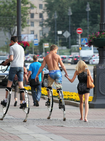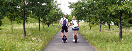 Kyiv, Ukraine August 8, 2023: A man and a woman holding hands ride along a park alley on electric unicycles