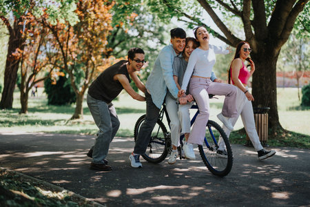 Three friends enjoying a joyful bicycle ride in a sunny park during the weekend