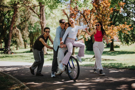 Three friends enjoying a leisurely bicycle ride in a sunny, green park