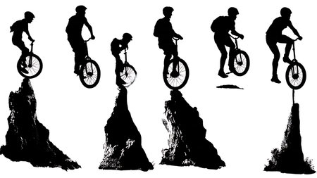 Black Solid Mountain Unicycling Silhouettes Set of Six on White Background isolated on plain white background.