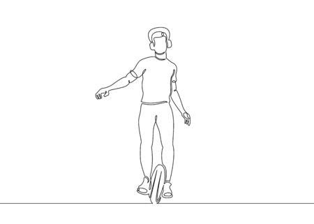 Continuous single drawn one art line electric self-balancing vehicle unicycles. Ecologically clean high-tech alternative transport. A self-balancing scooter, self-balancing board.Male character manages transport.