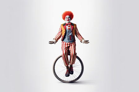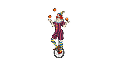 Professional circus performer juggling orange balls on one wheel cycle, striped costume and colorful makeup character