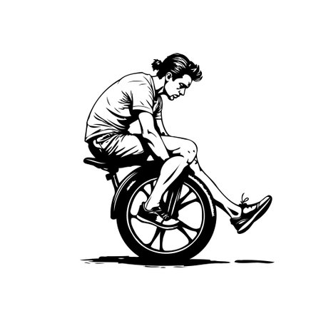 A black and white illustration shows a young man sitting casually on a unicycle, seemingly paused in thought. The image captures a moment of introspection within the context of an active lifestyle