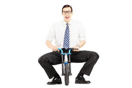 Smiling young businessman riding a small bicycle isolated on white background